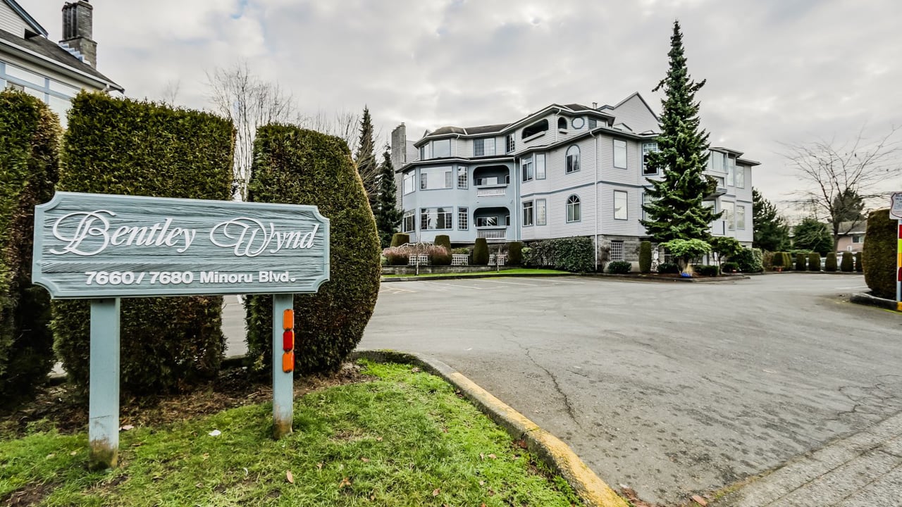 Bentley Wynd. It is a 10. Beautifully and totally remodelled unit. The most prestigious adult oriented building with a resort style living like beautiful park-like gardens and outdoor pool that you will ever find in central Richmond. Bright and quiet 2 bedrooms plus open den with a view to the inner garden and swimming pool. 10' ceiling throughout giving you a spacious feeling of over 1600 sq.ft of space. Updated kitchen cabinets from floor to ceiling, new flooring, new paint, new kitchen stainless steel appliance, new bathrooms and so on. Lots of storage spaces in and out of the suite. Gas fireplace. Built-in vacuum. Huge covered balcony. 2 parking stalls. Walking distance to everything. Well priced. Must see to appreciate. Book your viewing today!
